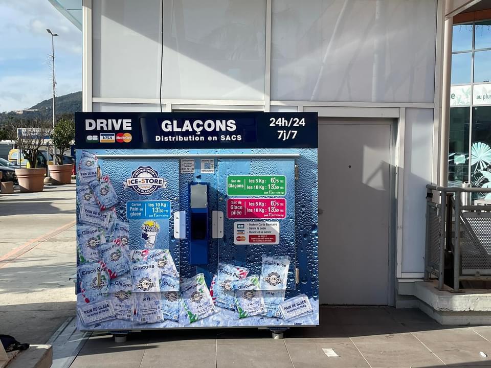 Retrouvez votre distributeur de glaçons préféré devant l\’entrée de votre CARREFOUR à AJACCIO-FINO ! Plus besoin de votre machine à glaçons, oubliez votre frigo américain, ICE STORE c\’est :