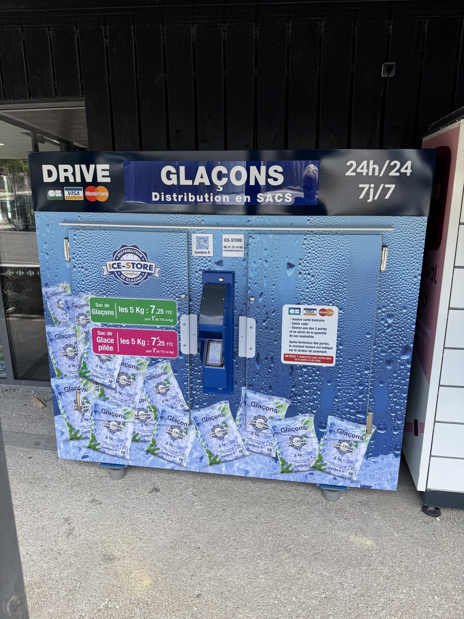 Retrouvez votre distributeur de glaçons préféré devant l’entrée de votre CARREFOUR à LACANAU ! Plus besoin de votre machine à glaçons, oubliez votre frigo américain, ICE STORE c’est :