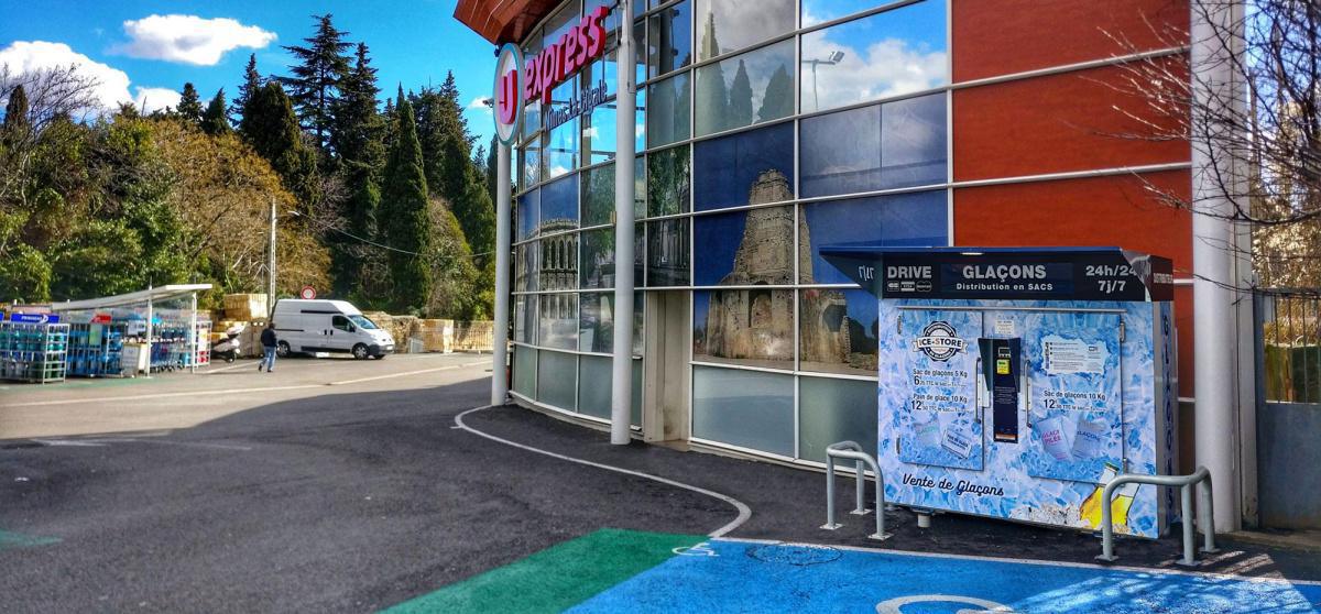 Retrouvez votre distributeur de glaçons préféré devant l\’entrée de votre U à NIMES LA CIGALE ! Plus besoin de votre machine à glaçons, oubliez votre frigo américain, ICE STORE c\’est :